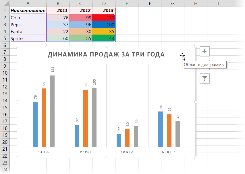 График в Excel не является статической картинкой. Между графиком и данными существует постоянная связь. При изменении данных «картинка» динамически приспосабливается к изменениям и, таким образом, отображает актуальные показатели.