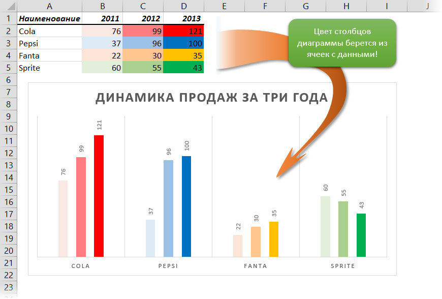 Хотелось бы, чтобы столбцы на гистограмме (или дольки на круговой и т.п.) автоматически имели тот цвет, который был использован для заливки соответствующих им ячеек с исходными данными: