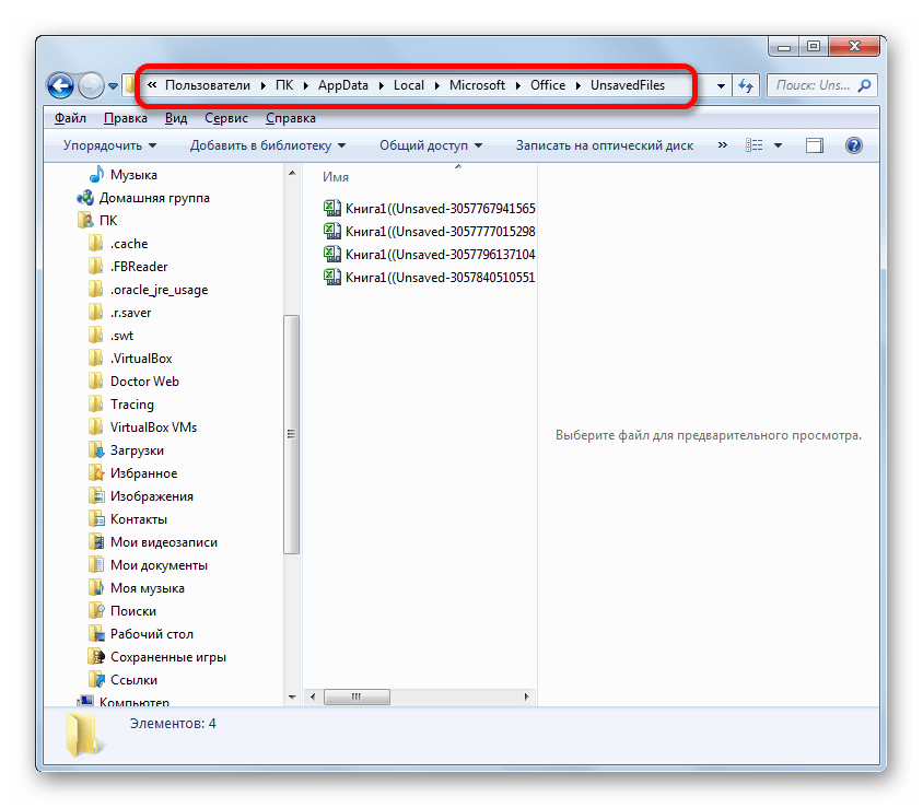 - Открывается окно восстановления. Причем оно открывается именно в той директории, где хранятся файлы несохраненных книг. Нам остается только выделить адресную строку данного окна. Именно её содержимое и будет являться адресом директории расположения несохраненных книг.