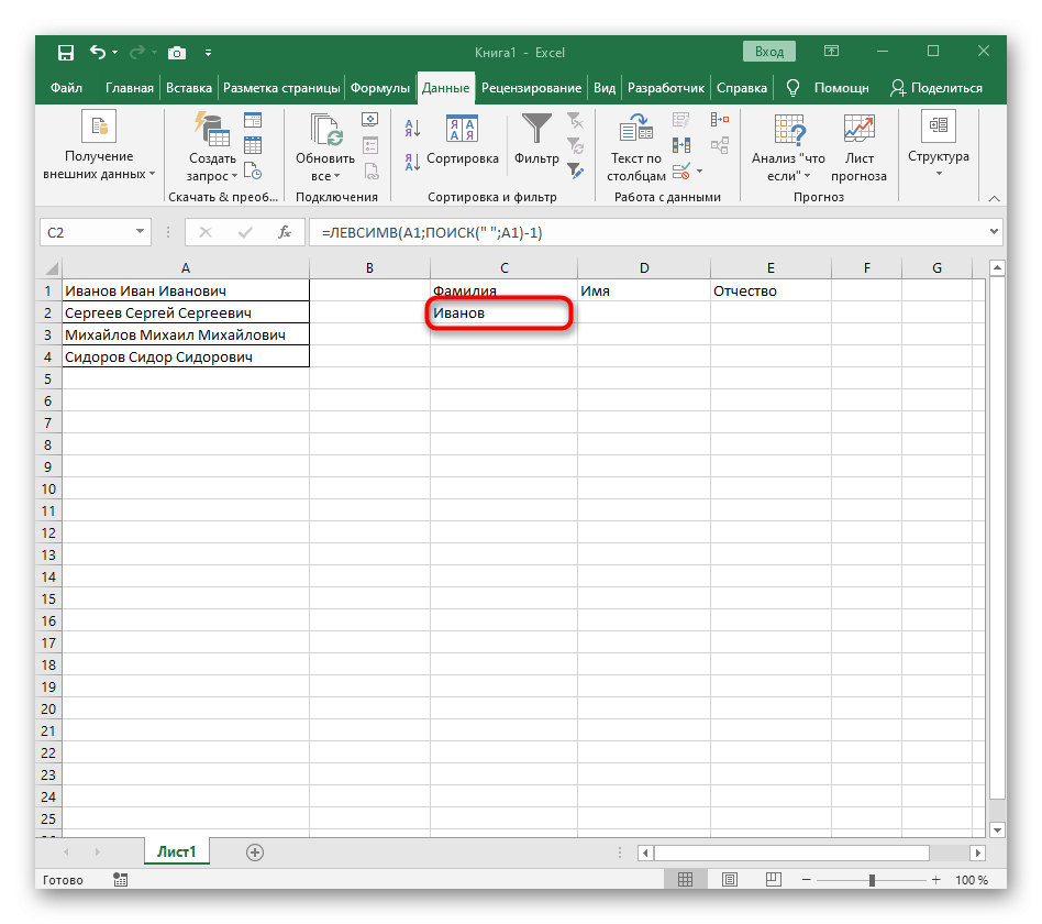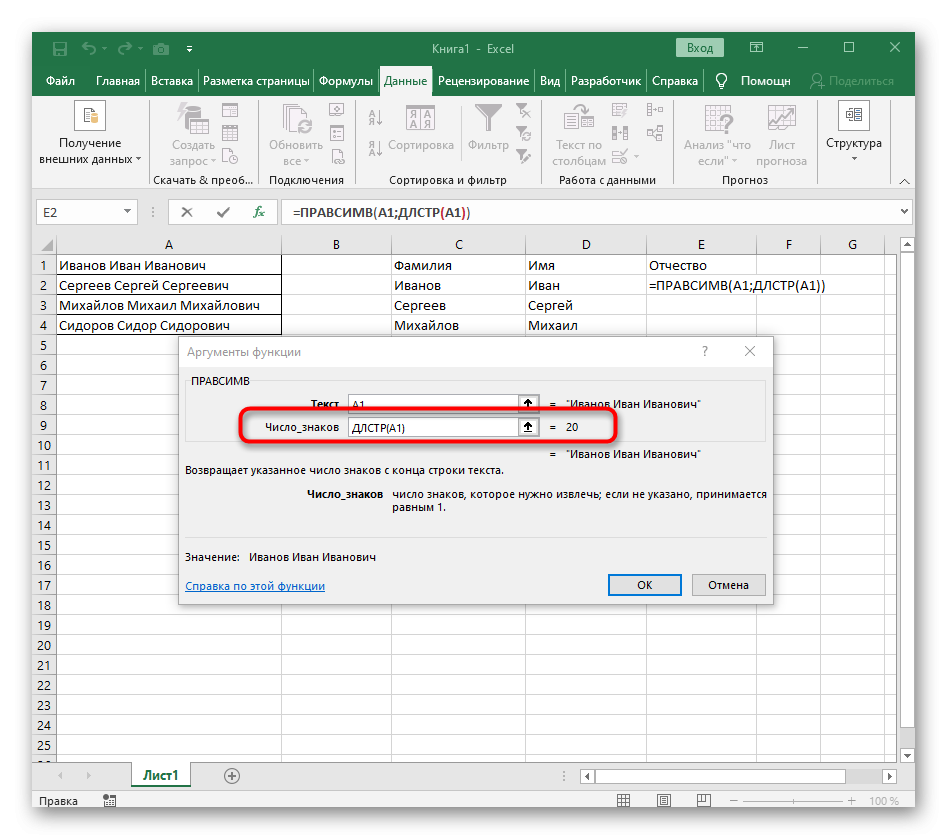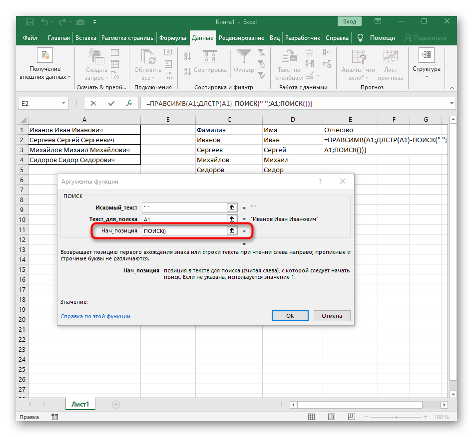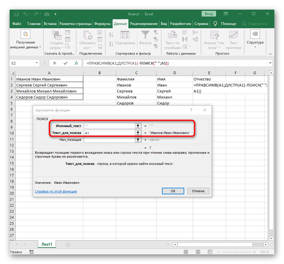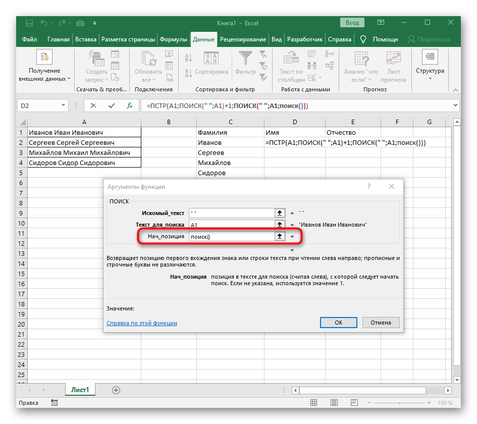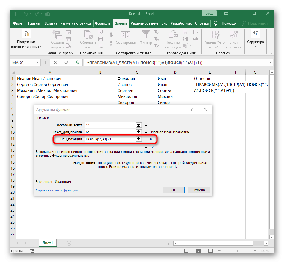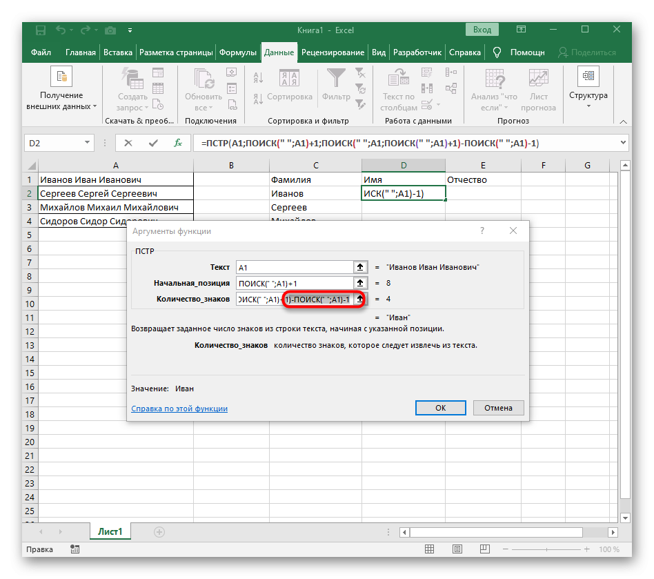 Кроме того, поскольку разделительного знака в конце строки нет, то количество символов в последнем слове (нашем случае – отчестве) вычислить не удастся, но это не проблема, достаточно указать заведомо бОльшее количество символов в качестве аргумента «число_знаков» функции ПСТР, например, 100.
