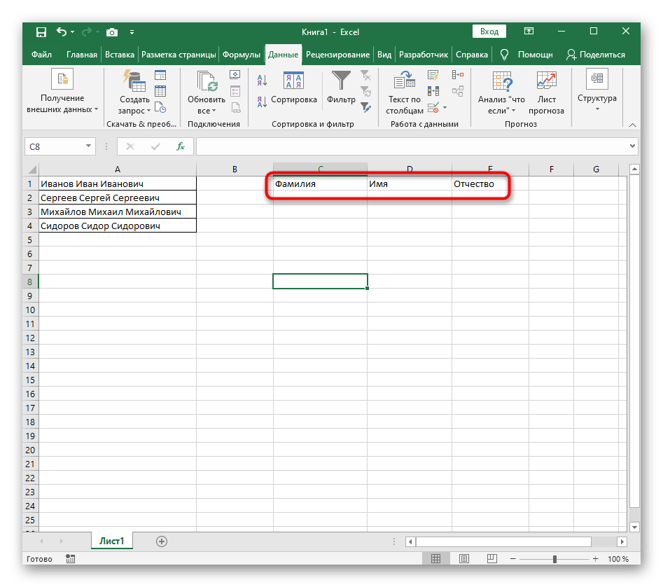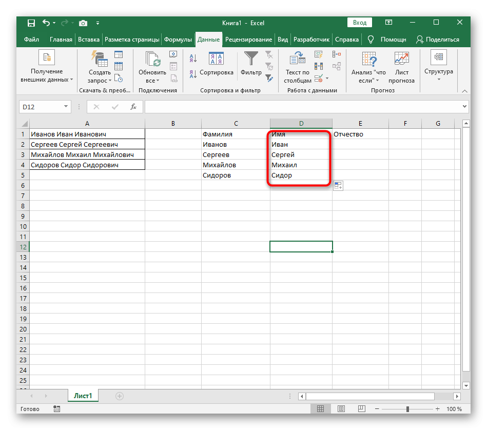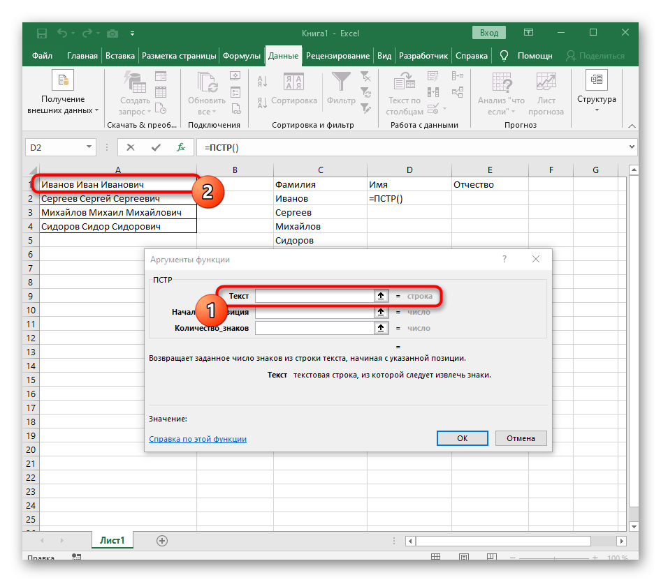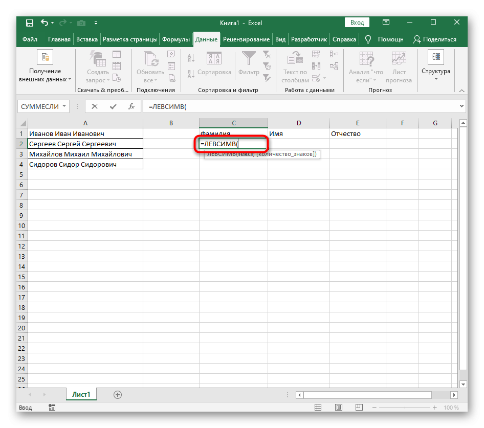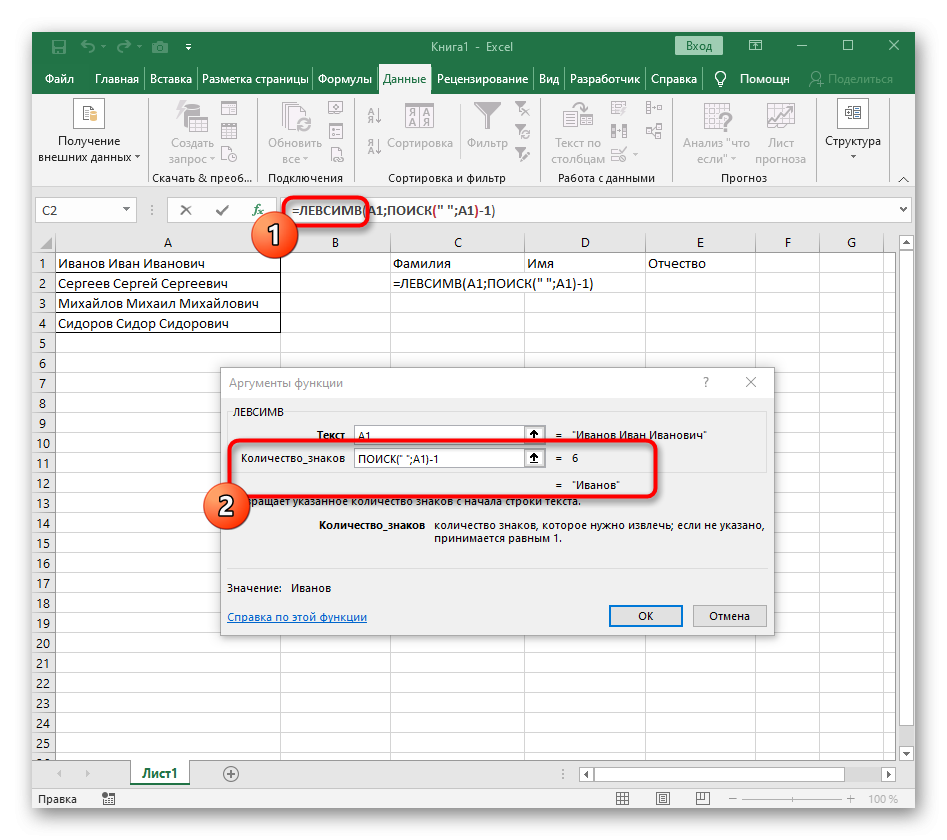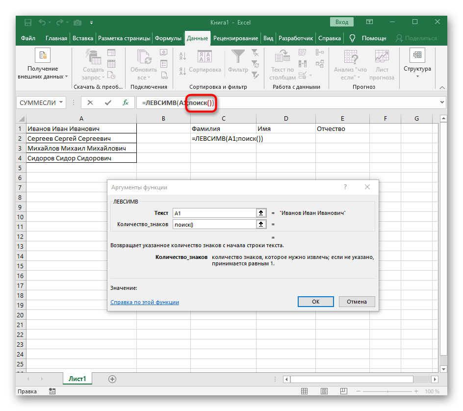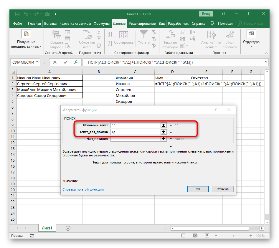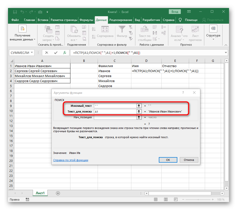 Кроме того, поскольку разделительного знака в конце строки нет, то количество символов в последнем слове (нашем случае – отчестве) вычислить не удастся, но это не проблема, достаточно указать заведомо бОльшее количество символов в качестве аргумента «число_знаков» функции ПСТР, например, 100.