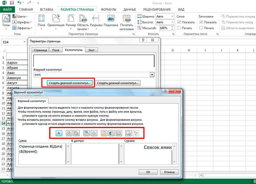 Снова открываем «Печать заголовков» и переходим на вкладку «Колонтитулы». Нажимаем кнопку «Создать верхний колонтитул» и заполняем нужные поля, как того просит наша фантазия