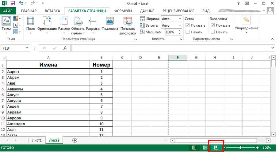 Откройте документ и нажмите на клавишу «Разметка страницы», которая расположена в нижней части рабочей области Excel;