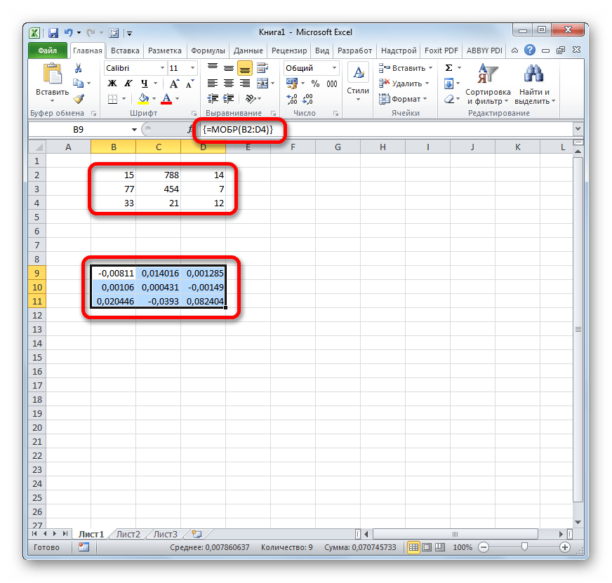 Функция МОБР позволяет производить вычисление обратной матрицы. Все правила ввода значений у этого оператора точно такие же, как и у предыдущего