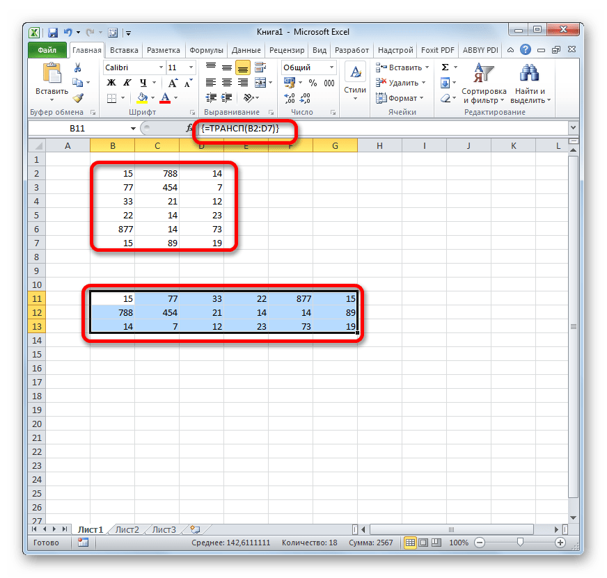 Функция ТРАНСП является типичным оператором массивов. Она позволяет переворачивать таблицы или матрицы, то есть, менять строки и столбцы местами. При этом она использует исключительно вывод результата в диапазон ячеек, поэтому после введения данного оператора обязательно нужно применять сочетание Ctrl+Shift+Enter. Также нужно отметить, что перед введением самого выражения нужно выделить на листе область, у которой количество ячеек в столбце будет равно числу ячеек в строке исходной таблицы (матрицы) и, наоборот, количество ячеек в строке должно равняться их числу в столбце исходника. Синтаксис оператора следующий: