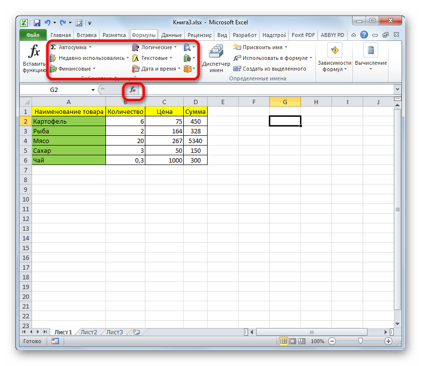 Наиболее удобно в качестве формул использовать уже готовые встроенные функции Excel. Доступ к ним можно получить через Мастер функций, нажав кнопку «Вставить функцию» слева от строки формул. Или же во вкладке «Формулы» на ленте можно выбрать одну из категорий, в которой находится интересующий вас оператор.