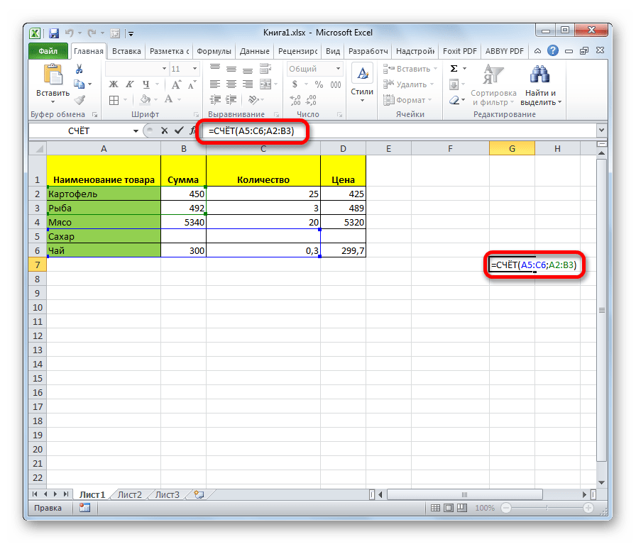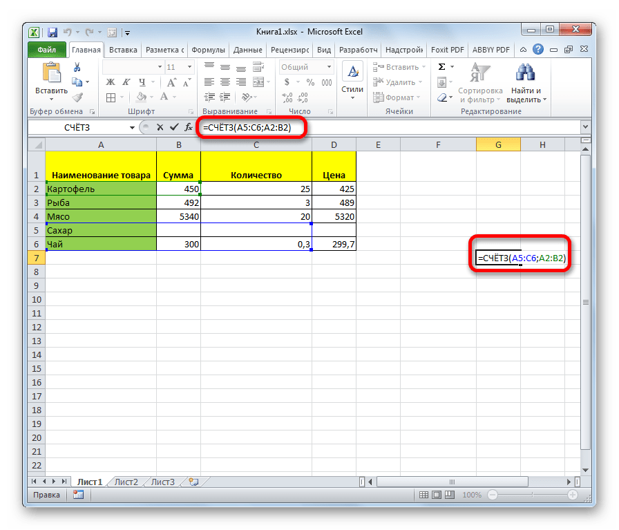 Можно также подсчитать ячейки из нескольких диапазонов. В этом примере подсчитываются ячейки в ячейках b2–D6 и b9–D13.