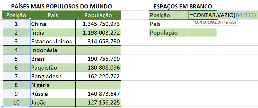 Мы можем видеть красным, что функция возвратила два пустых пространства в столбце «Население». Проведя конференцию на столе, мы заметили, что число жителей Индонезии и Нигерии не было напечатано.