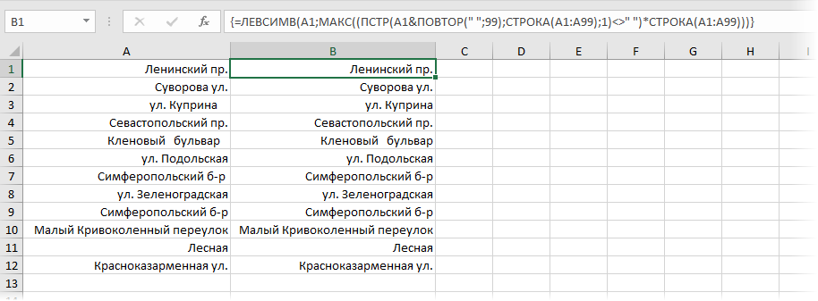 И обратите снимание, что ее нужно вводить как формулу массива (с Ctrl+Shift+Enter). В столбце A выровнять по правому краю получилось плохо из-за разного количества концевых пробелов в каждой ячейке. В столбце B эта проблема решена, и можно красиво расположить текст.