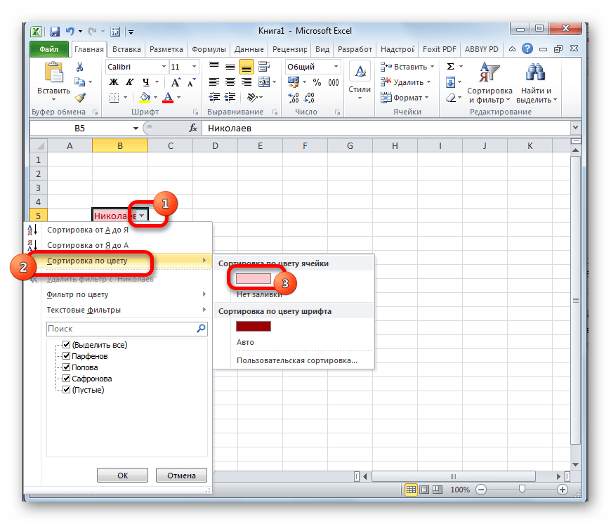 Кликаем по значку фильтра, в открывшемся меню наводим указатель мыши на строку “Фильтр по цвету”, после чего откроется еще одно подменю, где останавливаемся на варианте “Фильтр по цвету ячейки” или “Фильтр по цвету шрифта” (в данном случае, это неважно).