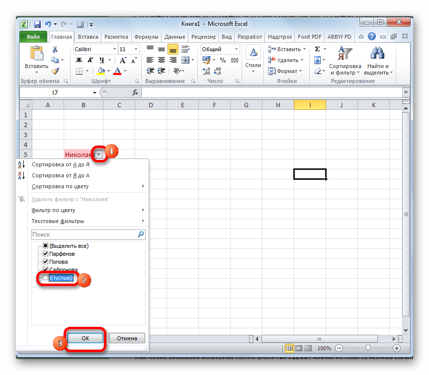 - Внутри самой верхней ячейки выделенного диапазона появится характерный значок фильтра в виде небольшого квадрата с треугольником, направленным вниз. Щелкаем по нему. Откроется меню, в котором убираем галочку напротив пункта “Пустые” и жмем OK.