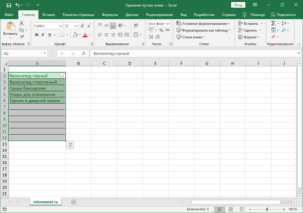 Более обычный метод удалить пустые элементы – это пользоваться инвентарем выделения групп ячеек.