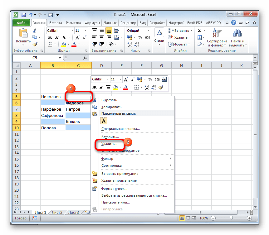 Ячейки бывают двух типов: содержащие данные и пустые. В зависимости от этого отличается и сам процесс их удаления, т.к. в программе предусмотрена возможность автоматизации процесса выделения и последующего удаления пустых ячеек.