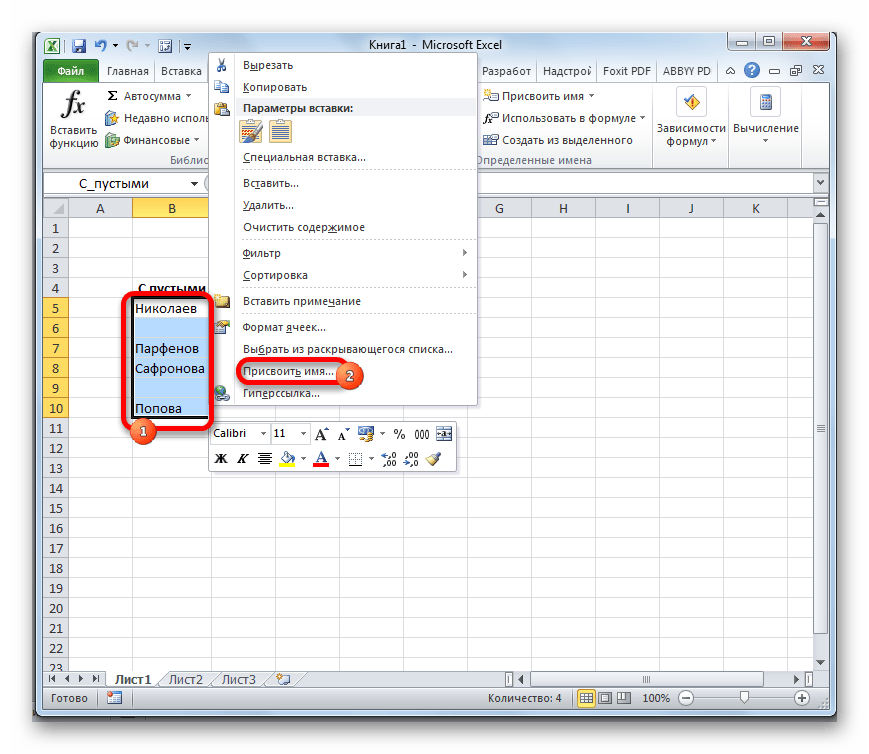 - Как и для первого диапазона, задаем имя (в нашем случае – “Без_пустых_ячеек”).
