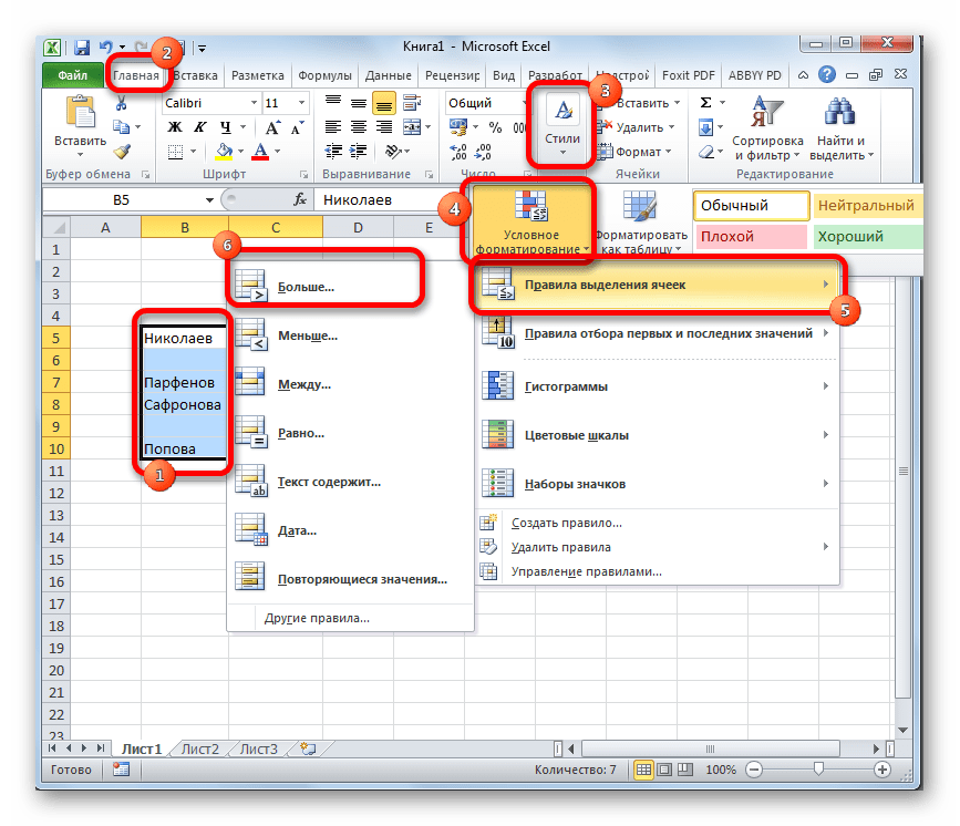 Выполняем выделение диапазона ячеек. В главной вкладке в группе инструментов “Стили” нажимаем кнопку “Условное форматирование”. В раскрывшемся перечне останавливаемся на варианте “Правила выделения ячеек”, затем – выбираем “Больше”.