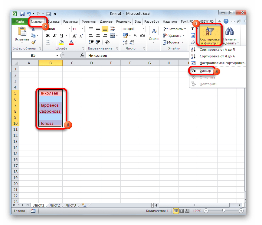 Повторно выделяем тот же самый диапазон (если выделение было снято) и включаем “Фильтр”.