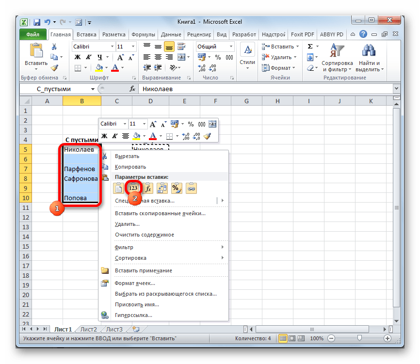 - На этом же (или другом) листе отмечаем соразмерный диапазон, затем щелчком правой кнопки мыши по нему раскрываем меню, в котором кликаем по варианту вставки – “Значения” (значок в виде папки с цифрами 123). Тут есть один нюанс – выделять нужно диапазон, который располагается ниже самой нижней строки области с первоначальными данными.