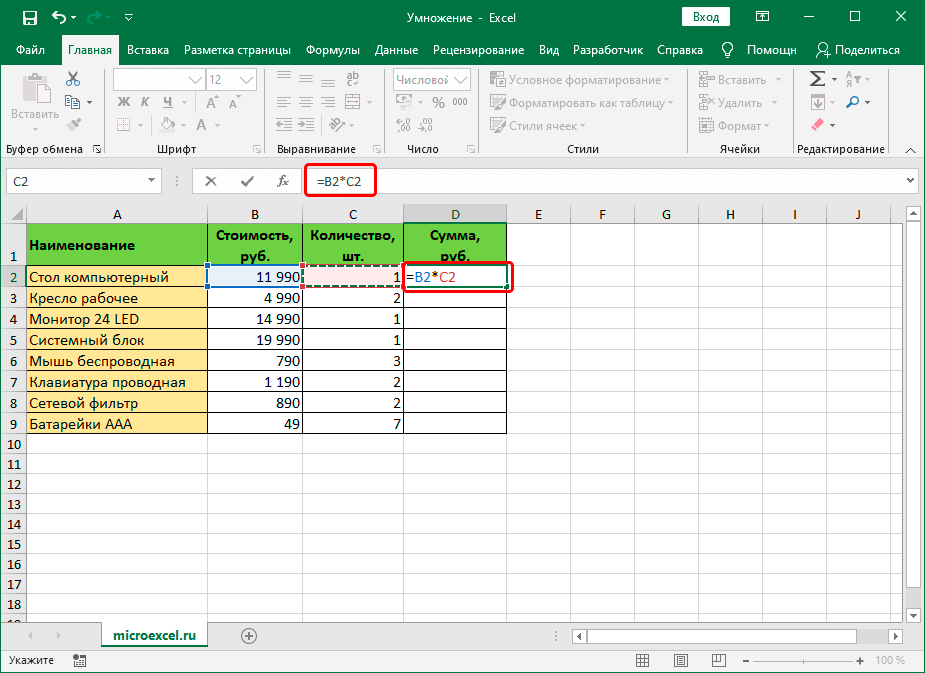 Формулу пишем в ячейке D2, и она имеет следующий конечный вид: =B2*С2.