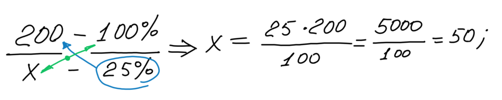 Х (икс) поднимается наверх, т.е. меняется местами с тем, что находится по диагонали от него, а 25% процентов просто поднимаются наверх по диагонали. Далее производим элементарные вычисления и находим Х (икс).
