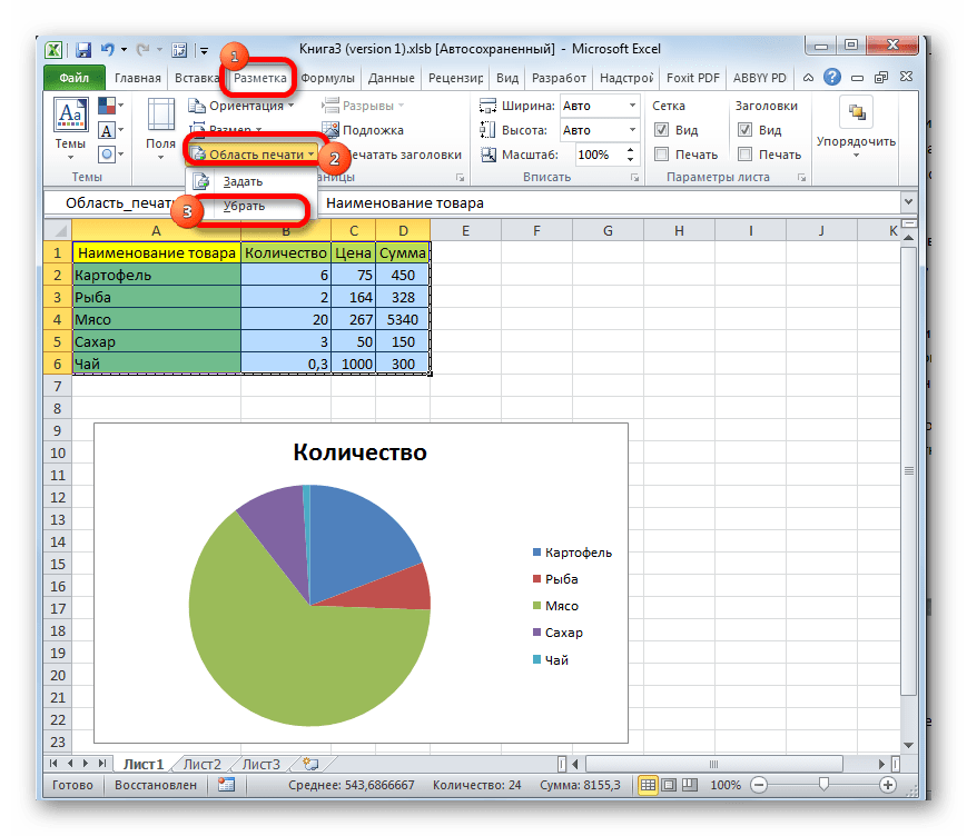 Если когда-нибудь понадобится распечатать весь лист или другой фрагмент, то в этом случае потребуется снять закрепленную область печати. Находясь во вкладке «Разметка страницы», кликаем на ленте по кнопке «Область печати». В открывшемся списке кликаем по пункту «Убрать». После данных действий область печати в данном документе будет отключена, то есть, настройки возвращены к состоянию по умолчанию, как будто пользователь ничего не изменял.
