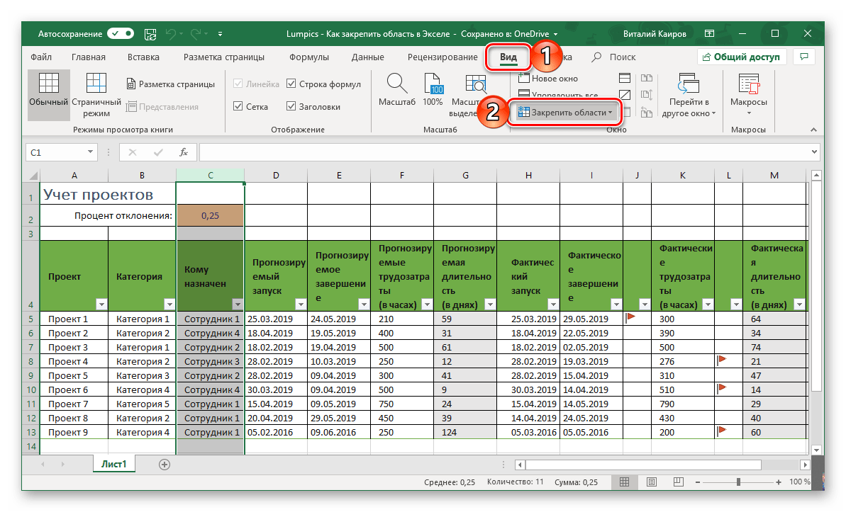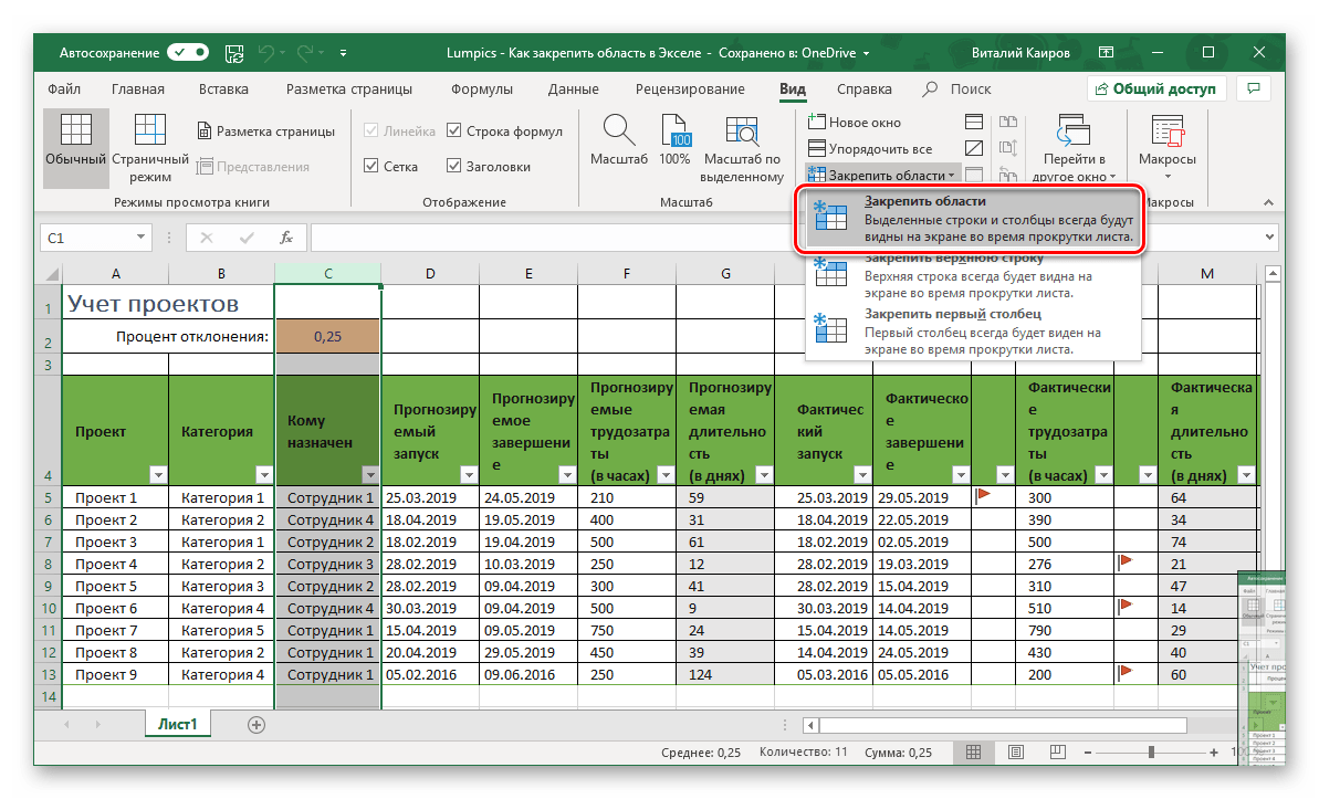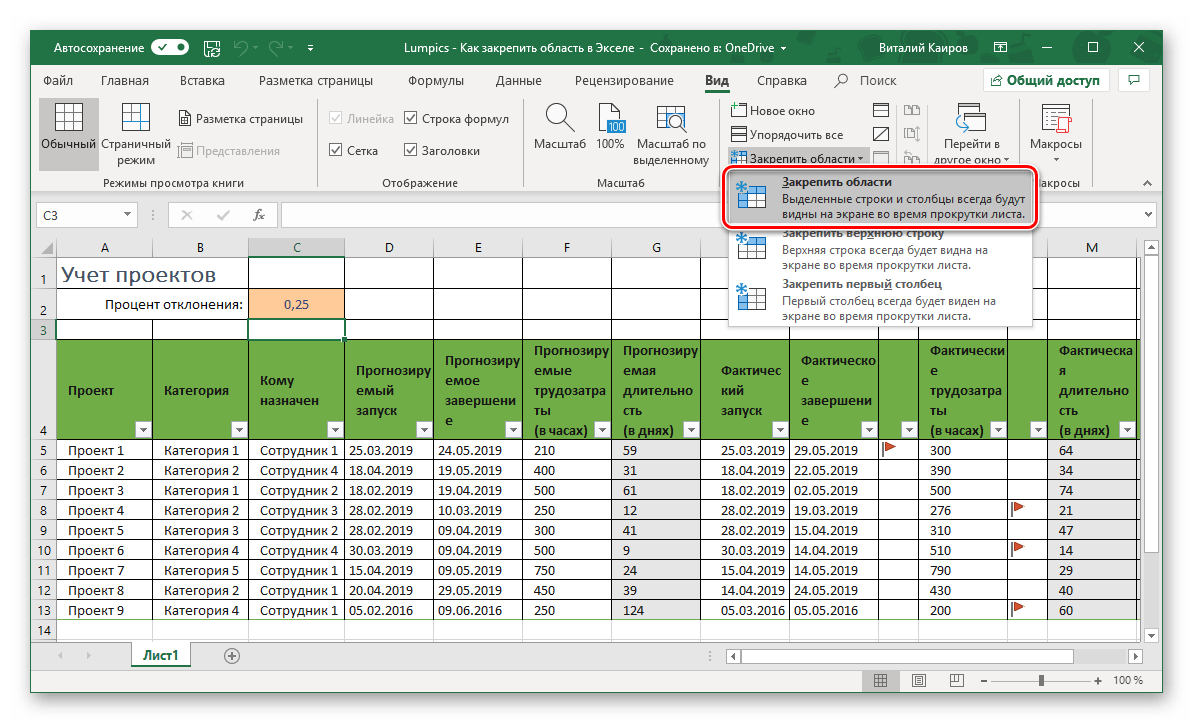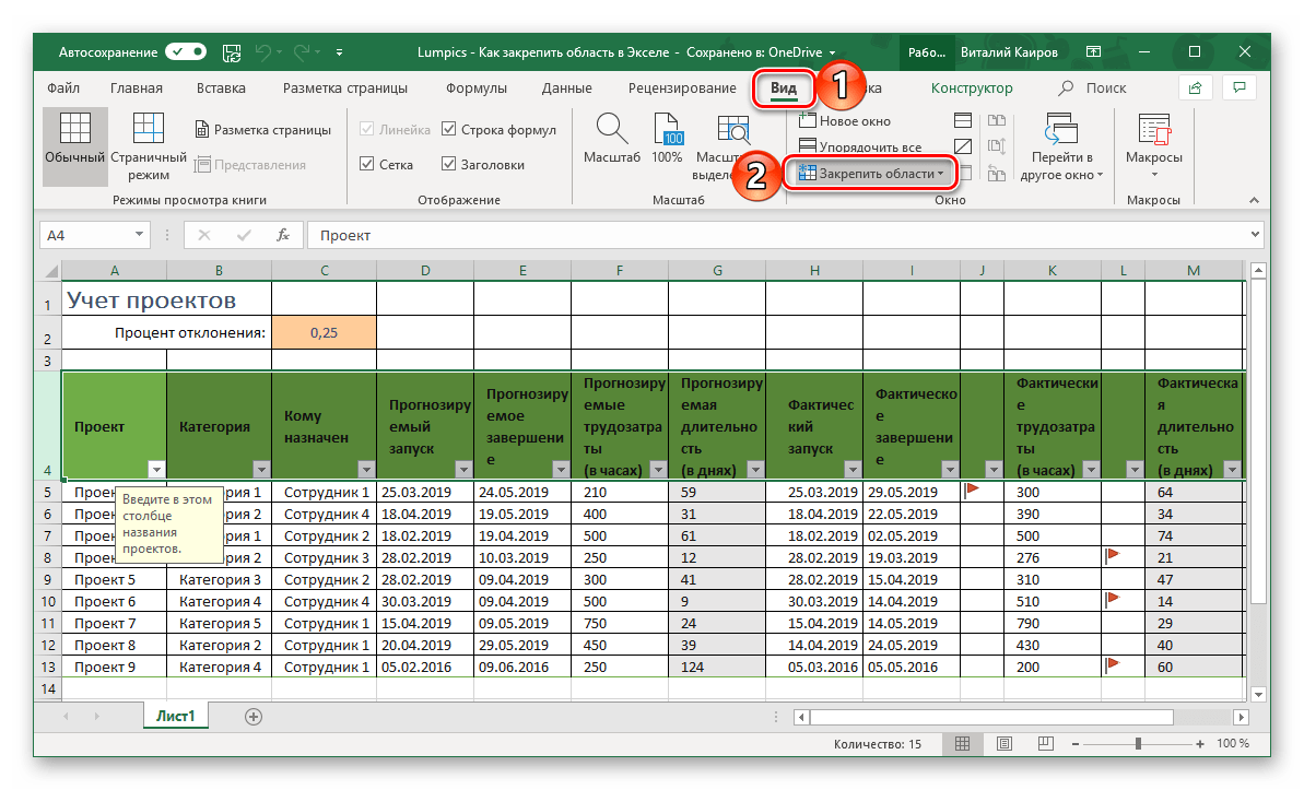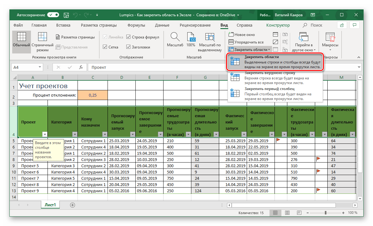Перейдите во вкладку «Вид» и в группе инструментов «Окно» разверните меню пункта «Закрепить области».