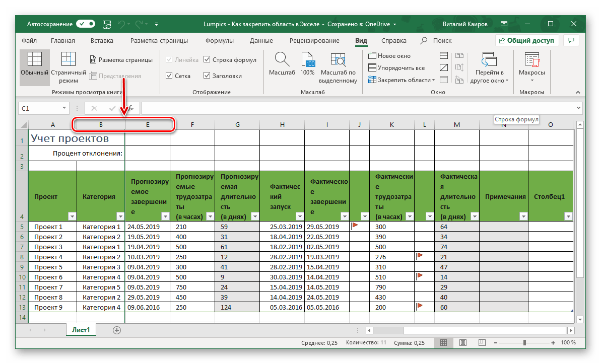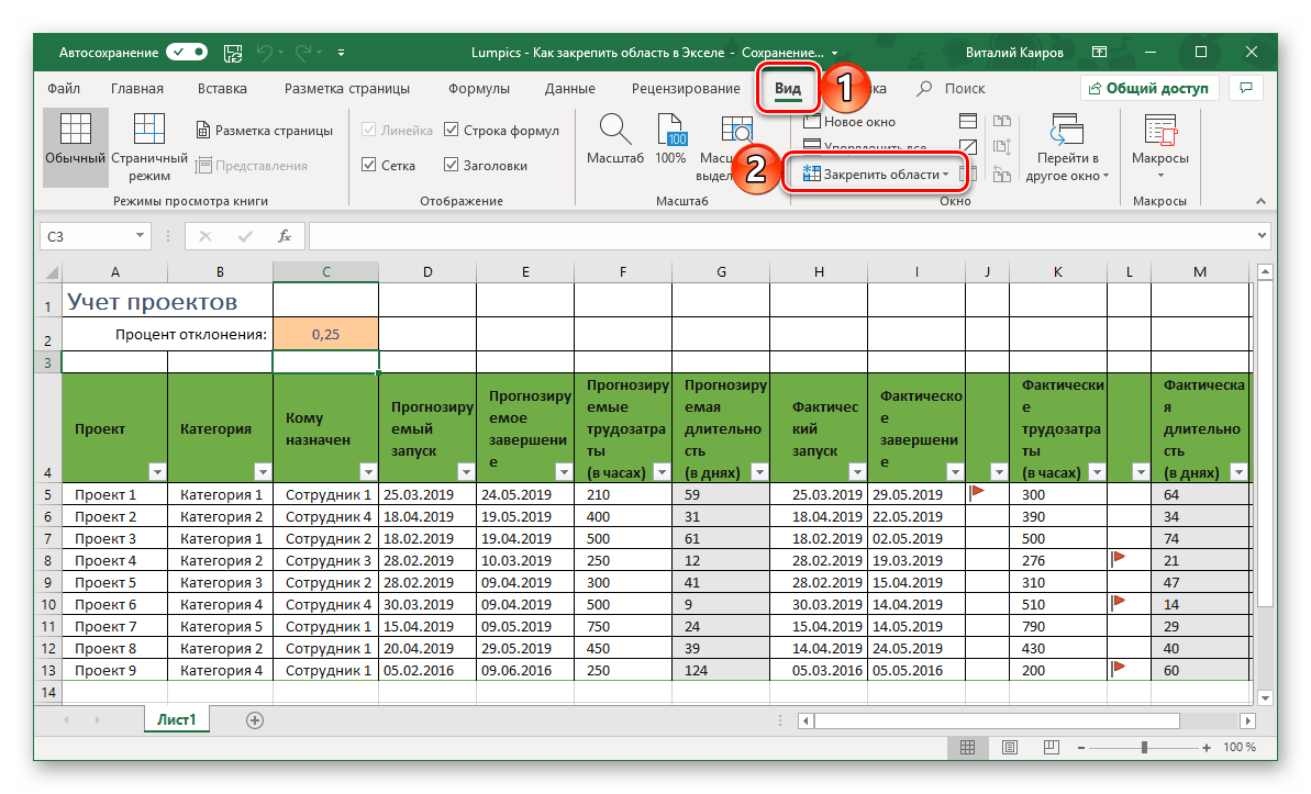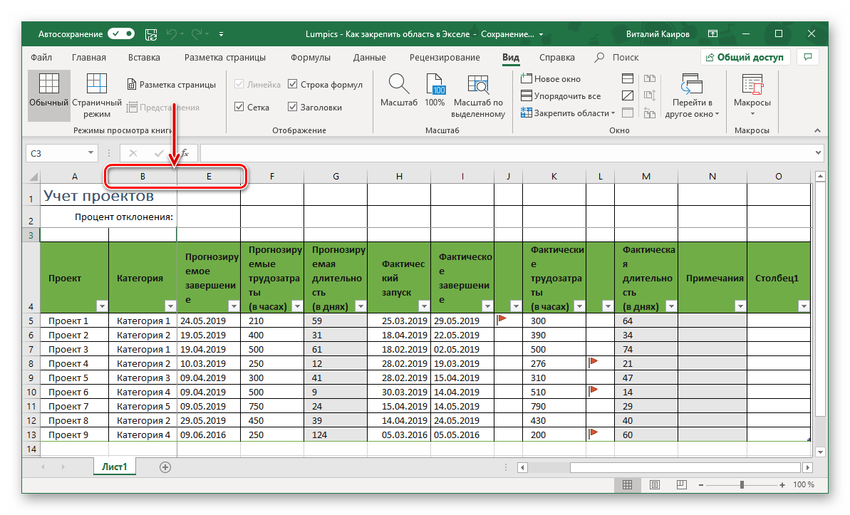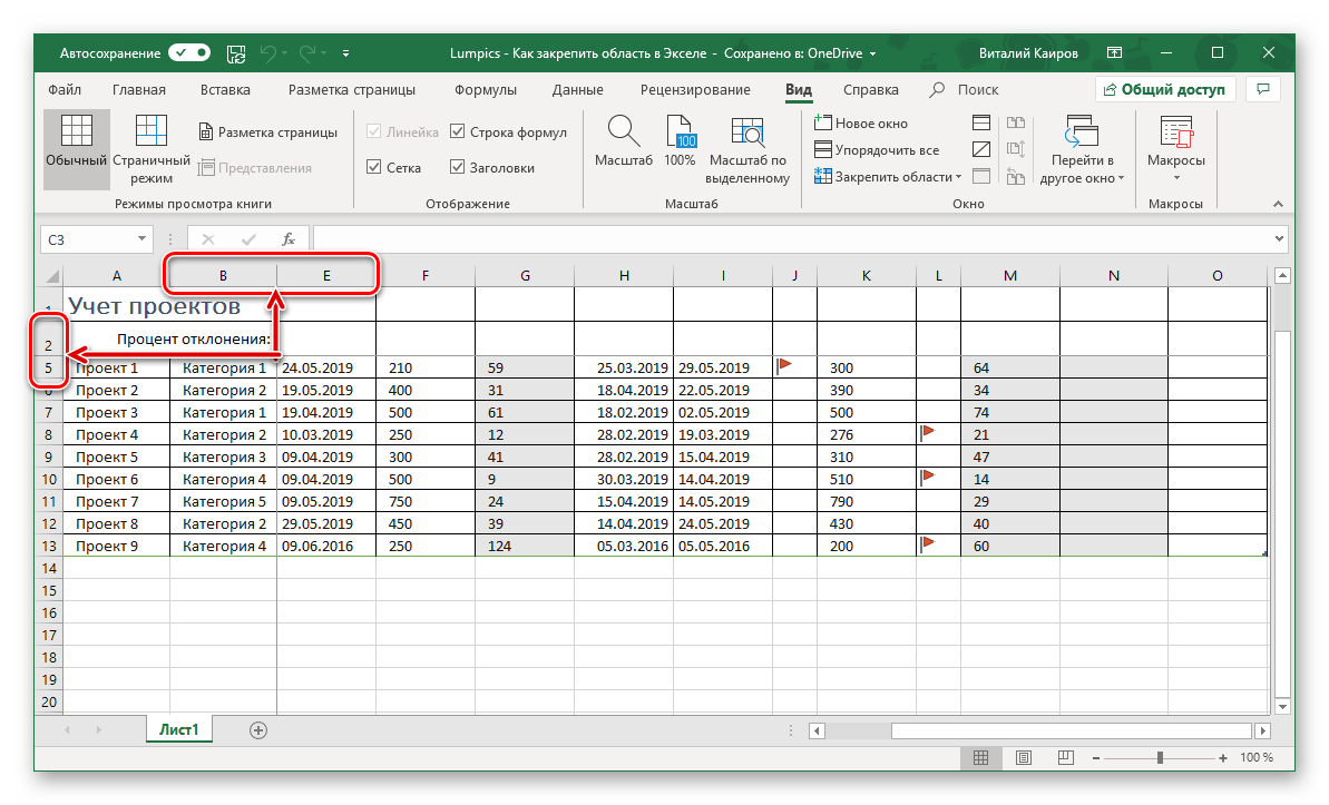 Откройте вкладку «Вид» и воспользуйтесь пунктом «Закрепить области».