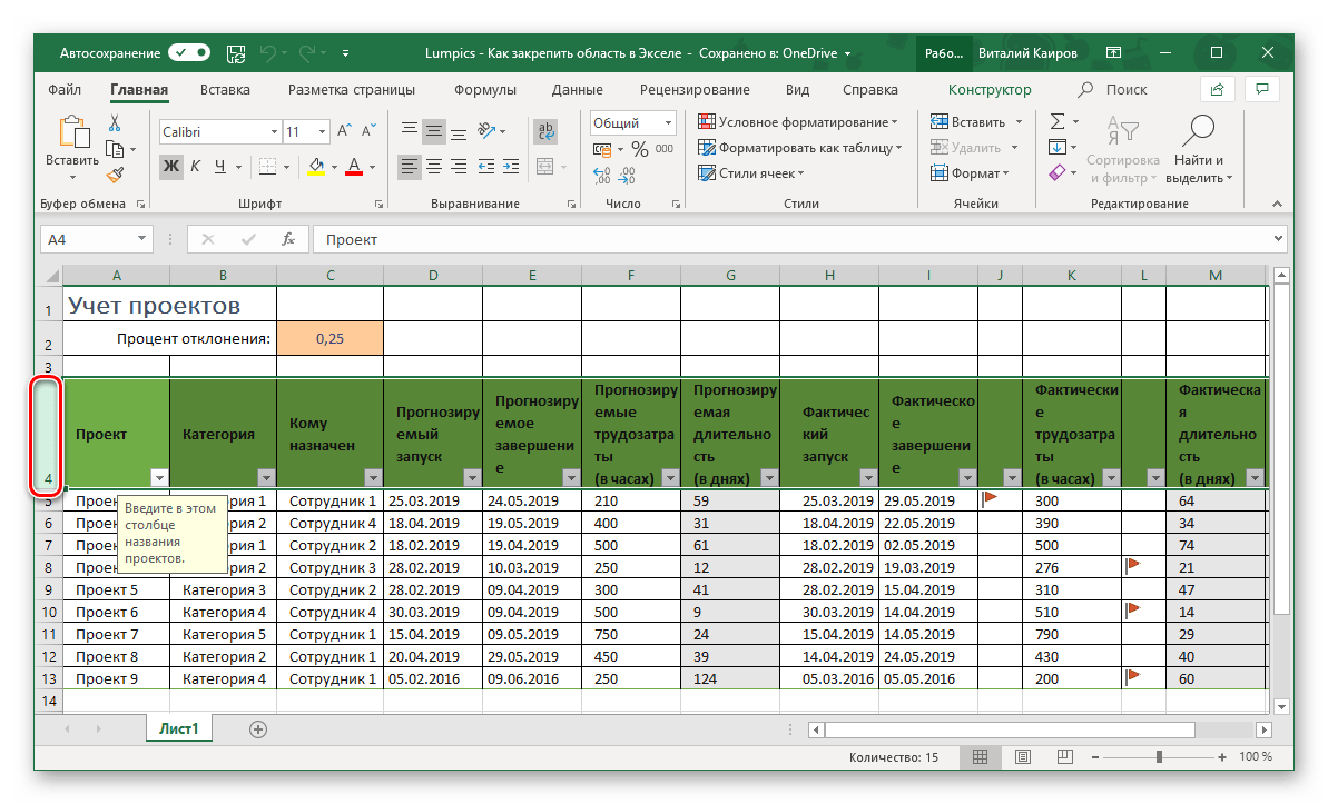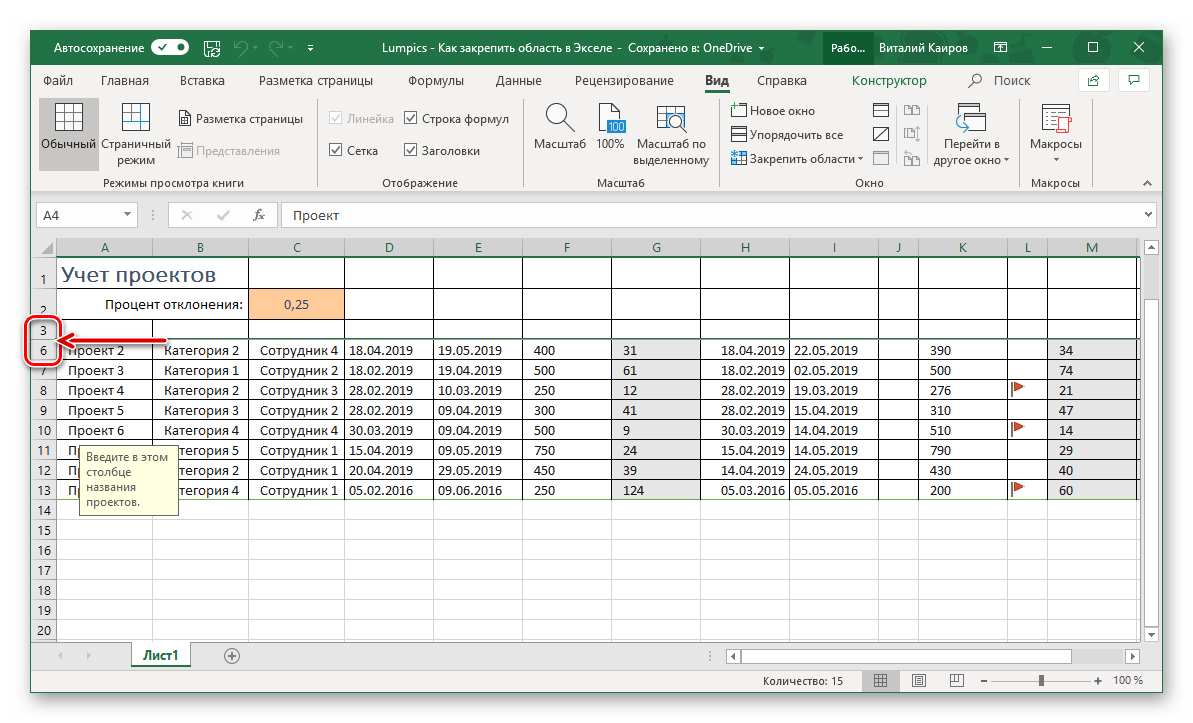 Закрепление области в Эксель