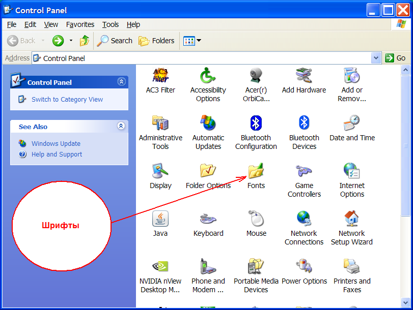 Нажмите кнопку Пуск, Выберите Панель Управления, в ней найдите иконку Шрифты