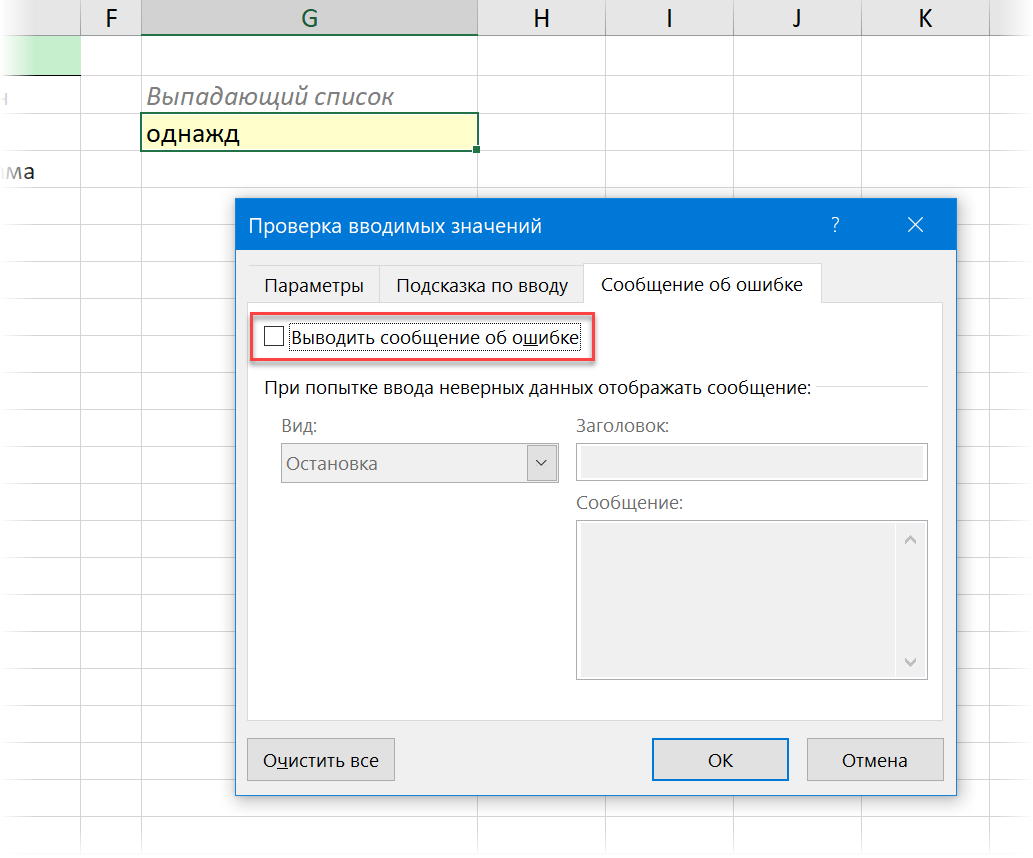 Чтобы Excel не ругался при вводе на неточное совпадение наших фраз с исходным списком, на вкладке Сообщение об ошибке (Error Alert) в этом окне нужно выключить флажок Выводить сообщение об ошибке (Show error alert) :
