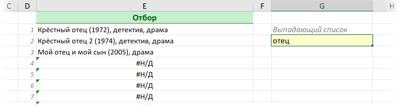После этого можно поиграться, вводя в жёлтую ячейку G2 разные слова и фразы и понаблюдать за тем, как наши формулы отбирают только подходящие фильмы: