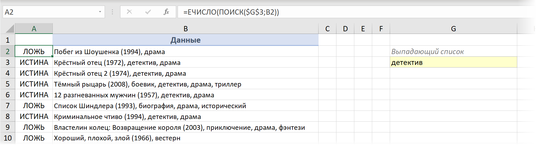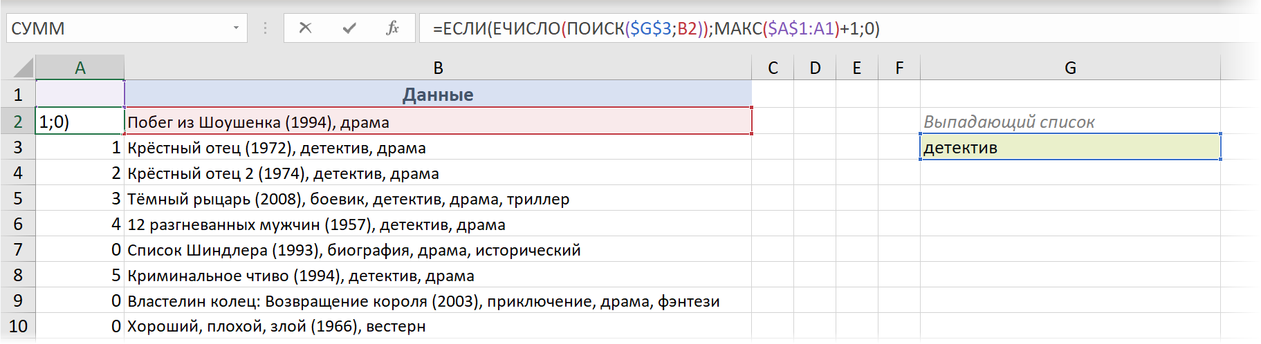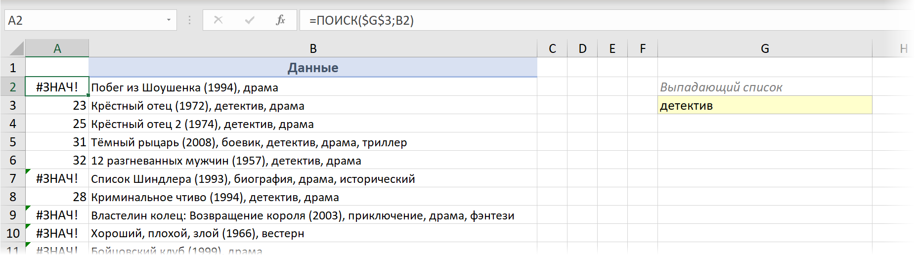 Сначала нам нужно понять, какие из исходных ячеек нужно показывать в списке, т.е. определить содержится ли введённый в выпадающем списке текст (например, жанр «детектив») в названии фильма. Для этого добавим слева от исходных данных еще один столбец с функцией ПОИСК (SEARCH ) , которая ищет заданную подстроку в тексте и выдает либо порядковый номер символа, где он был обнаружен, либо ошибку, если его там нет: