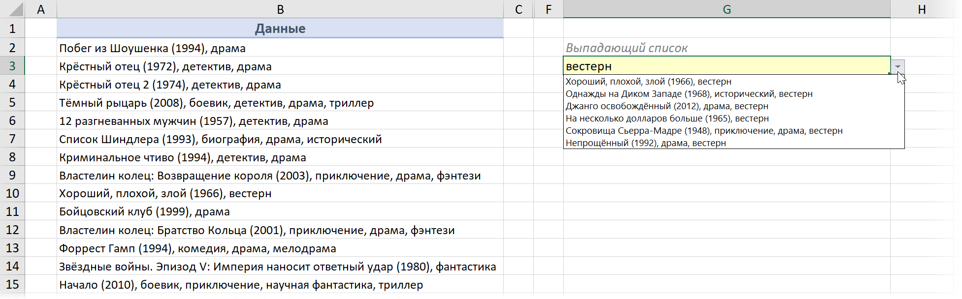 Конечная цель — создать выпадающий список (ячейка G3), в котором можно будет быстро находить нужные фильмы, введя только жанр, год или фрагмент названия, например «гамп».
