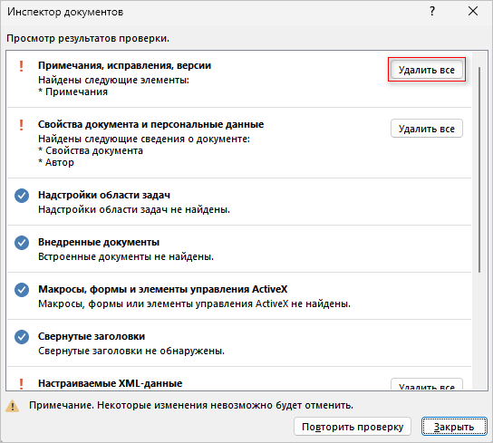 - После завершения проверки вы увидите, что были найдены примечания. В пункте «Примечания, исправления, версии» нажмите на кнопку «Удалить все», чтобы удалить все комментарии из документа.