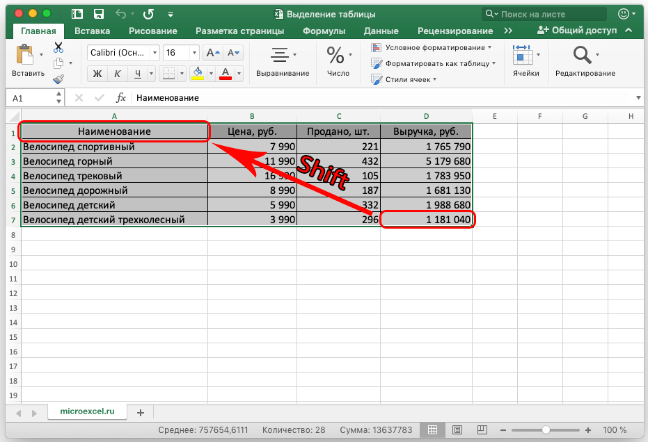 Удерживая нажатой клавишу SHIFT, щелкните последнюю ячейку, которую нужно включить в новую выделенную область. В новую выделенную область войдет прямоугольный диапазон между активная ячейка и ячейкой, которая была щелкнута.