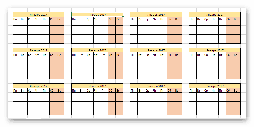 Теперь рассмотрим более сложный способ создания календаря. Он заключается в том, что вы, как при обычной работе с Эксель, формируете таблицу, затем объединяете некоторые ячейки, самостоятельно выбираете оформление для них, после чего в ячейках, в которых будут находиться календарные дни, прописываете соответствующую формулу. В примере создаем один месяц. Остальные можно будет сформировать по аналогии.