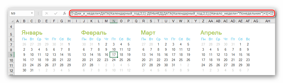 Если вам интересно, каким образом формируется календарь, вы можете кликнуть на любой его «день». В строке формул вы увидите формулу, которая определяет, какое число будет отображено в ячейке.