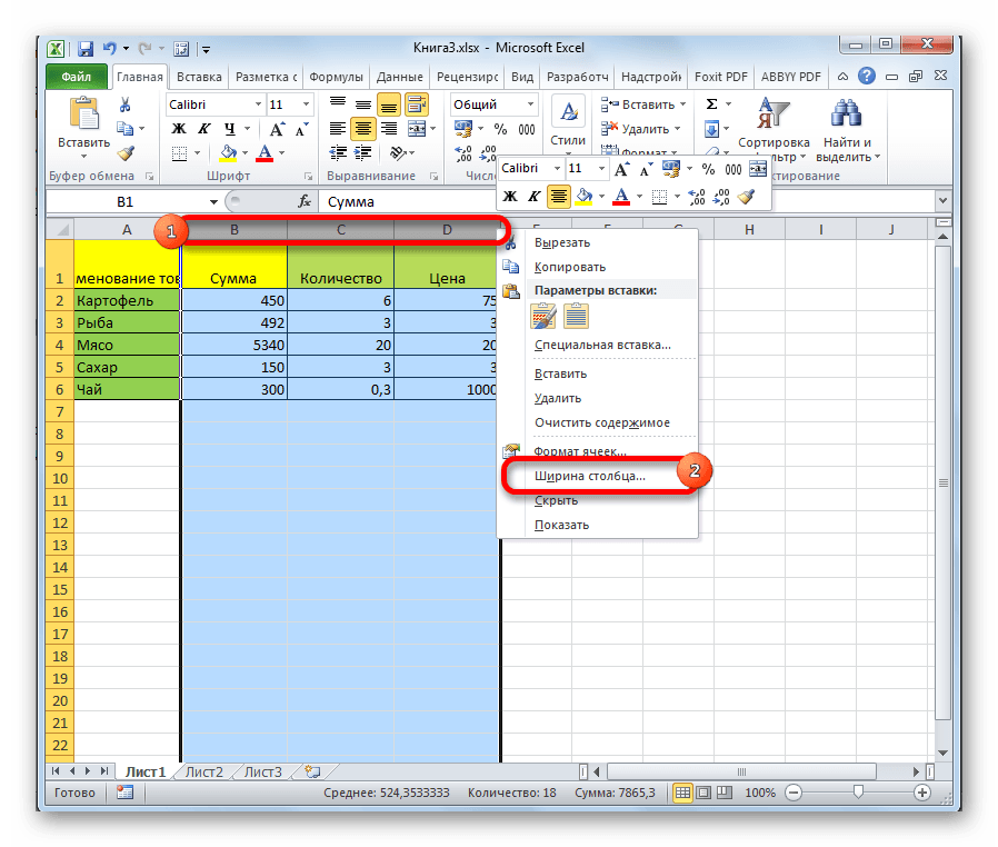- задайте требуемую ширину столбцов А, B иС;