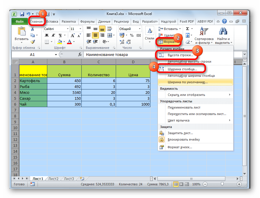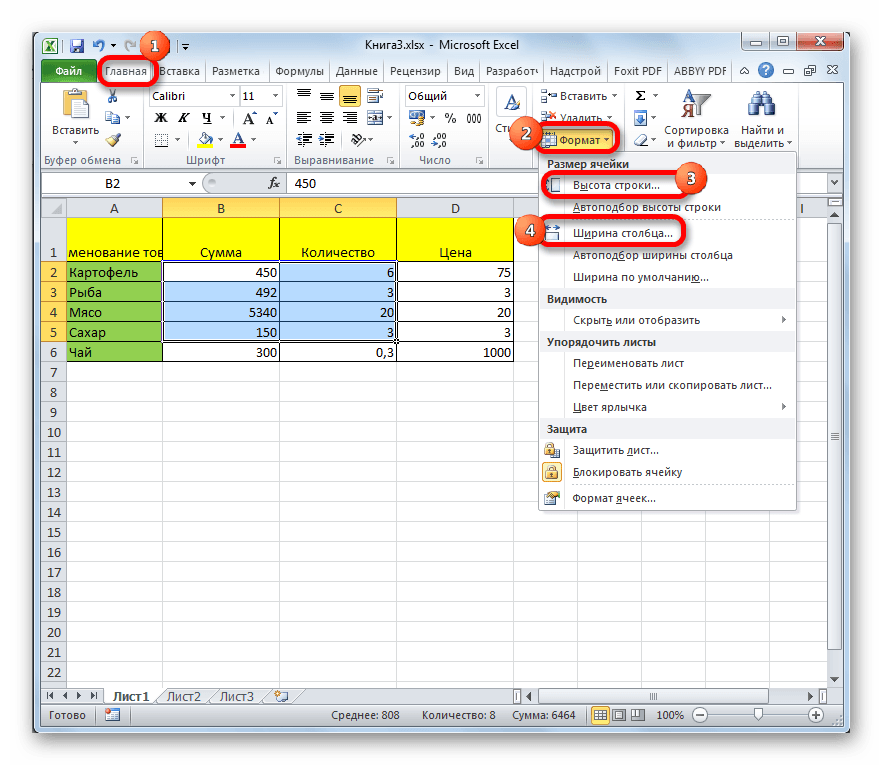 2. Ширина столбцов и высота строк в Excel.