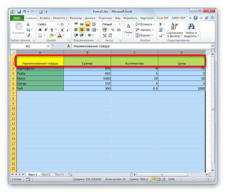 3. Как закрепить верхнюю строку (левый столбик) в Excel.