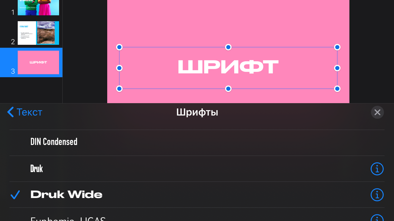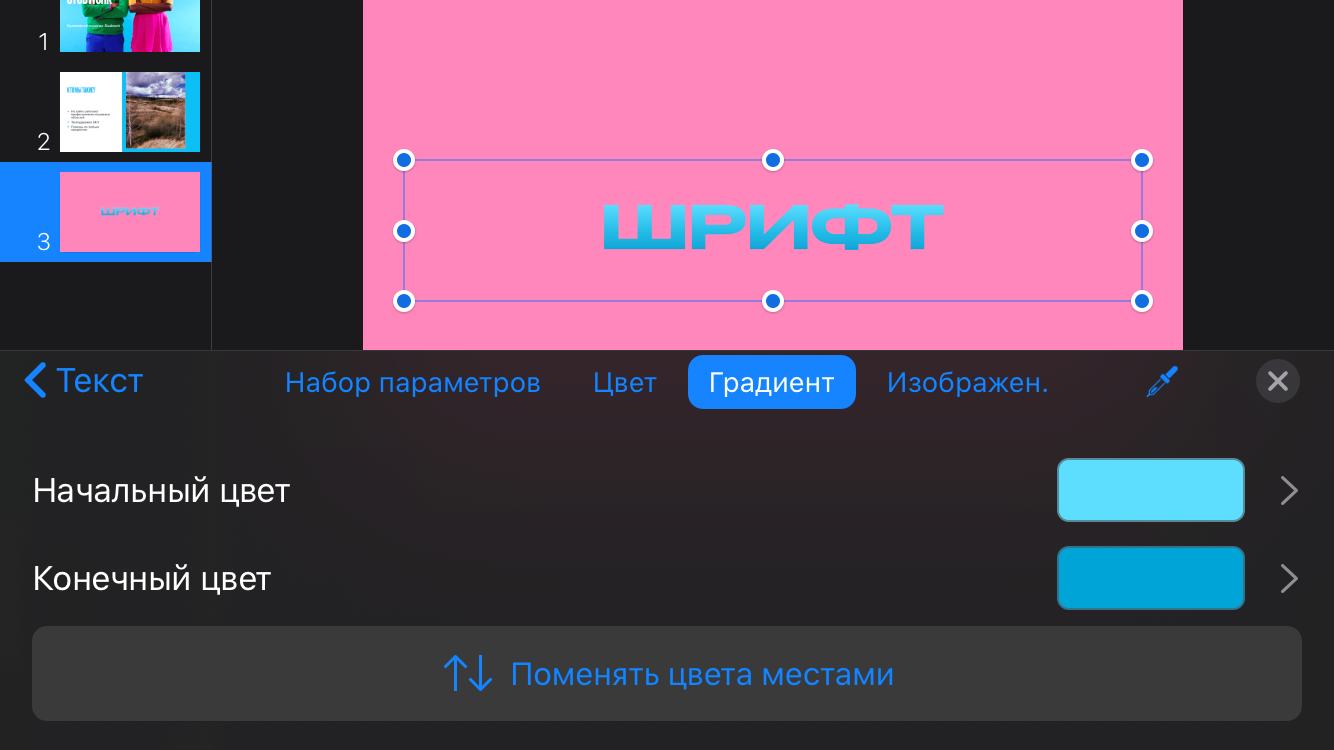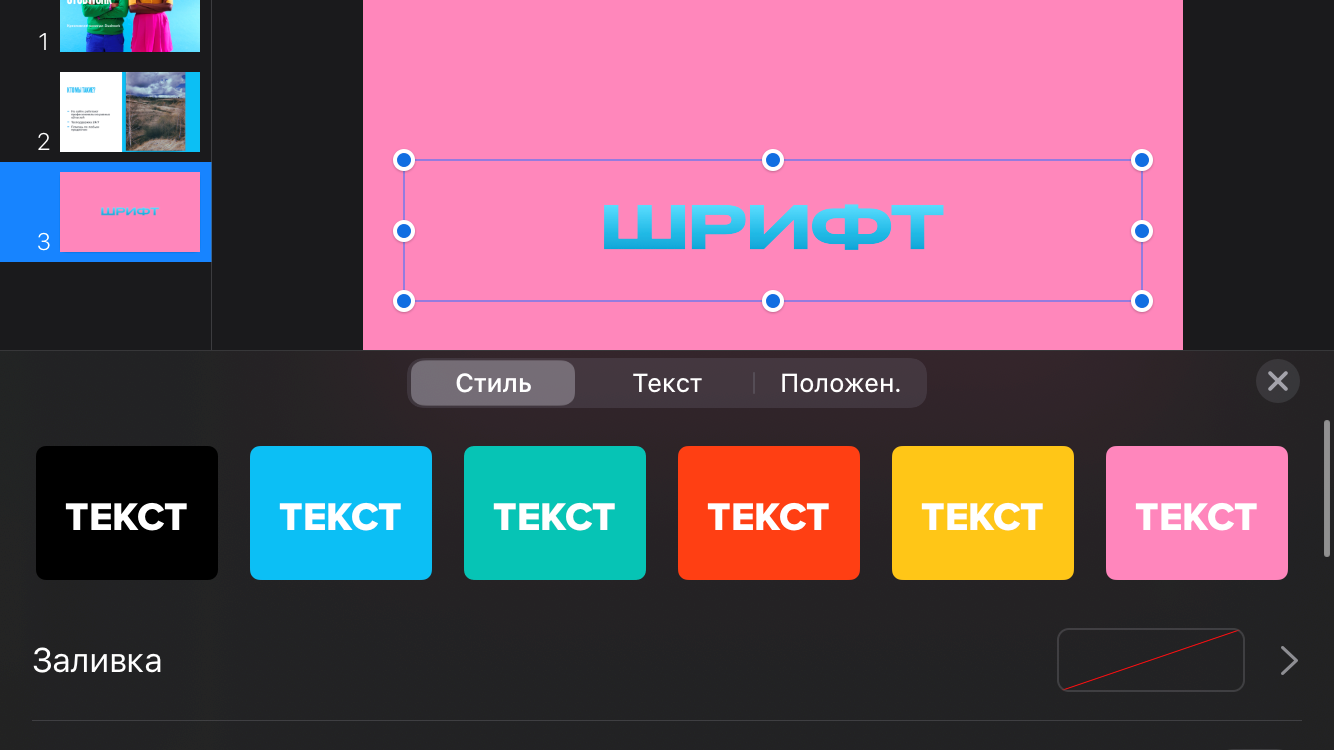 После того как вы выбрали шаблон слайда, можете вносить на него свои изменения. Программа предоставляет множество шрифтов и размеров, которые можно использовать. А также вы можете изменять положение и прозрачность текста, добавлять на него анимации и многое другое. Чтобы начать редактирование, нужно нажать на кисточку в верхней панели.