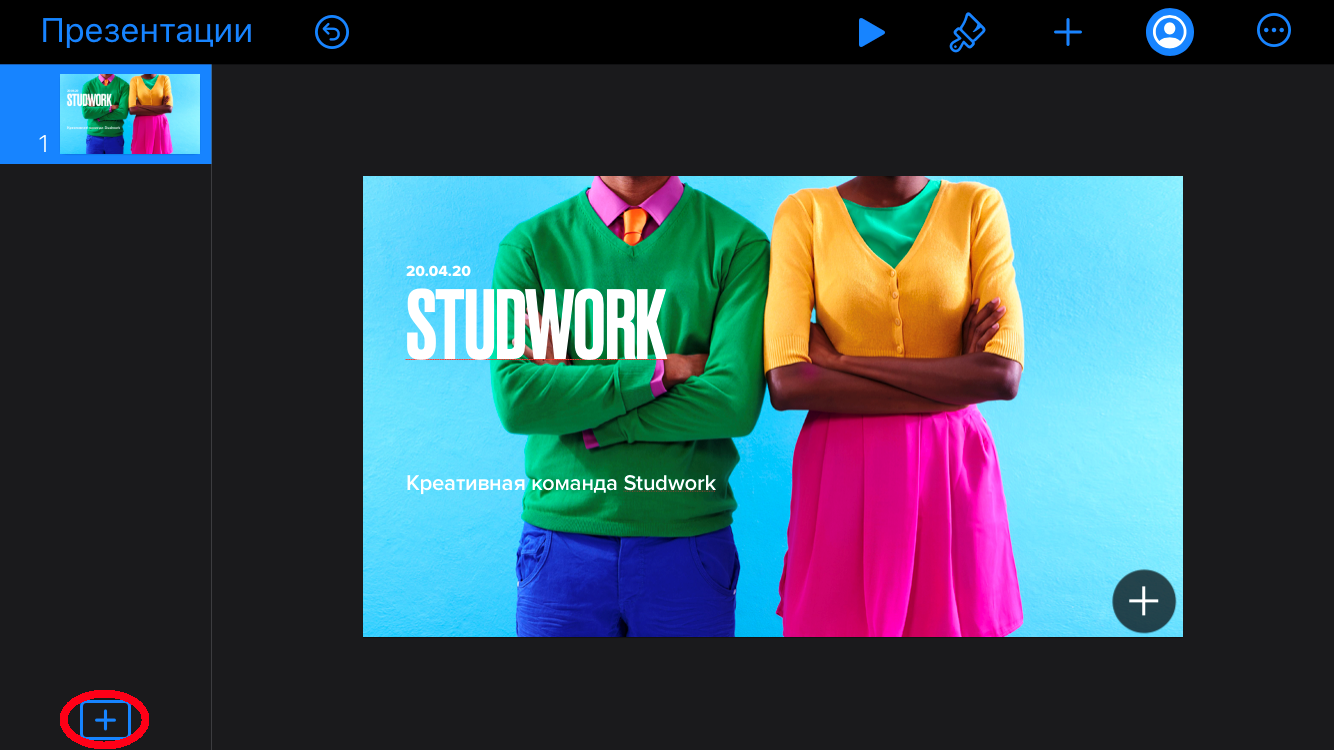 После того как тема выбрана, можно начать добавлять свои элементы на слайды. Чтобы добавить новый слайд, необходимо нажать на плюсик внизу экрана.