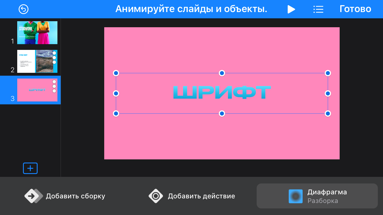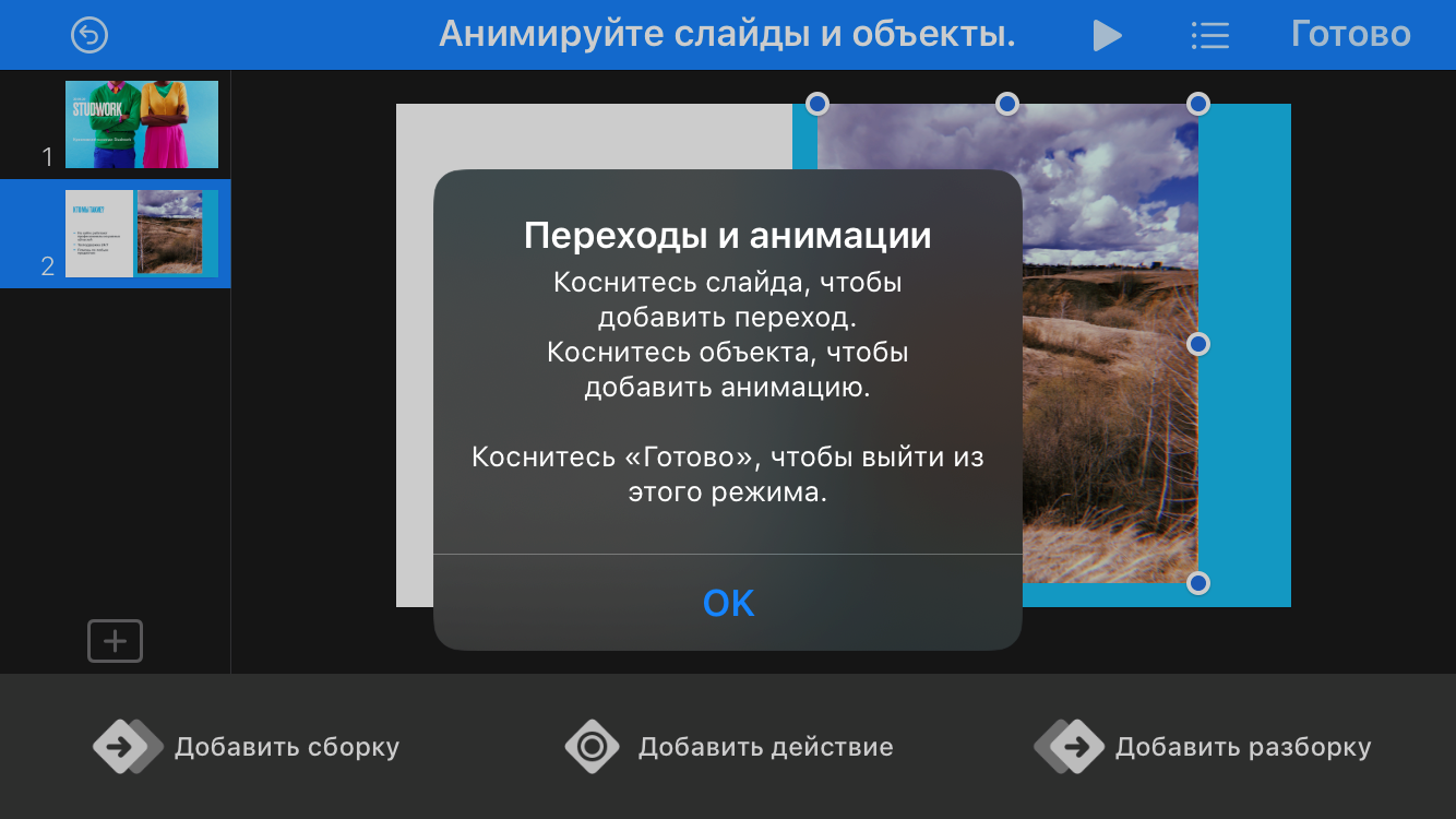 Вы можете добавить анимацию на слайд с помощью нажатия на него.