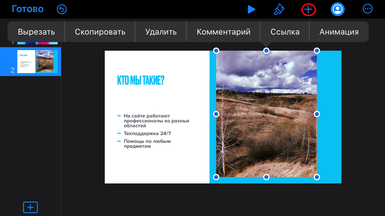 Чтобы вставить объект, необходимо нажать на «+» в верхней панели. Выберите из библиотеки телефона тот файл, который необходимо разместить на слайде.