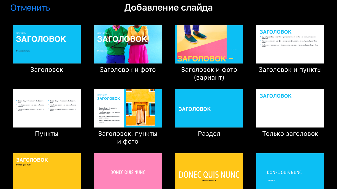 Закончили оформление первого слайда? Переходите ко второму. Программа откроет большую библиотеку шаблонов, вы можете выбрать любой из предложенных и начать с ним работу.