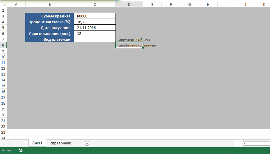СОЗДАНИЕ ПОДСКАЗКИ АВТОМАТИЧЕСКИ КОДОМ VBA Здесь особо рассказывать нечего — лучше сначала скачать файл, приложенный к статье. Там есть лист «справочник», в котором забита пара значений для подсказок и лист, в котором подсказки создаются. Как это работает. Выделяются ячейки для создания подсказок(в примере это D15:D16 ). И кнопкой запускается код, который в выделенных ячейках создаст всплывающие подсказки. Сам принцип: код просматривает каждую выделенную ячейку и если она не пустая запоминает её значение. Ищет это значение в первом столбце листа «справочник» и если находит — создает гиперссылку и значение из второго столбца листа «справочник»(в строке с найденным значением) вставляет в качестве подсказки к гиперссылке. Но помимо этого код перед созданием гиперссылки запоминает большую часть форматирования текста в ячейке и после создания гиперссылки возвращает его. Хотя и здесь не без ложки дегтя — код не сможет корректно обработать и вернуть смешанное форматирование (например, разный цвет шрифта в одной ячейке, разный стиль и т.п.). Но подсказки при этом все равно будут созданы. Что следует знать: код ищет каждое значение ячейки полностью, а не каждое слово отдельно. Это значит, что если в ячейке будет записано «аннуитентный платеж», а не просто «аннуитентный» как в примере — то подсказка для такой ячейки не будет создана. Если добавить или изменить значения в листе «справочник», то для того, чтобы подсказки обновились необходимо запустить код заново. Внесение изменений в сам код при этом не требуется. Созданные подсказки останутся в файле даже если удалить сам код. Т.е. если создать подсказки в файле, а затем файл переслать другому человеку — он сможет использовать подсказки без дополнительных действий.