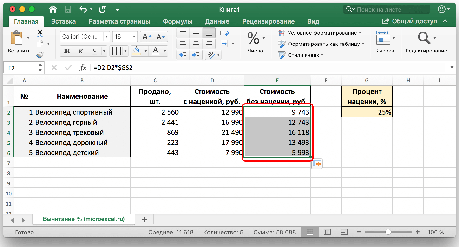 Таким образом, результат вычета определенного процента со всех значений в столбце мгновенно будет посчитан и расставлен по своим местам.