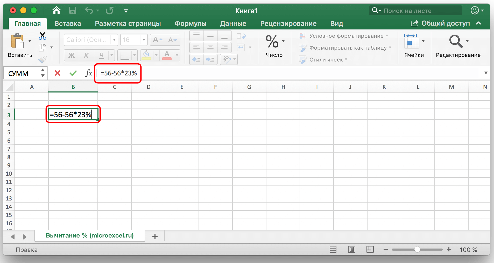Например, вычитание 23% из числа 56 пишется следующим образом: 56-56*23%.