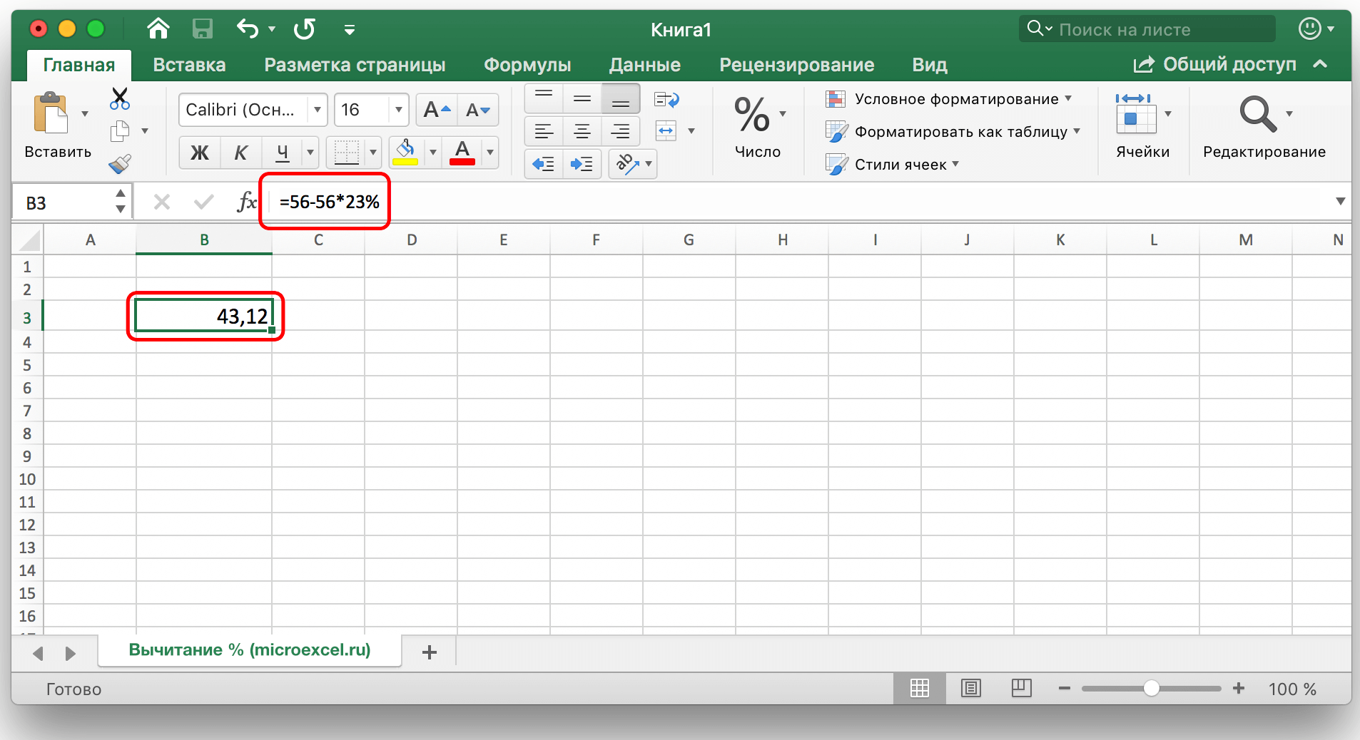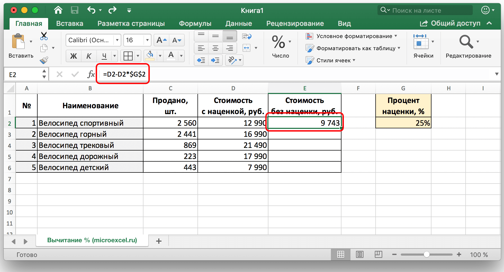 = Цифра (ячейка) – Цифра (ячейка) * Процент (%).