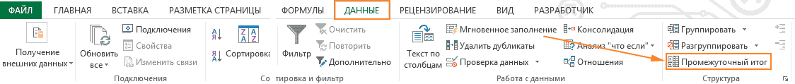 - Откройте вкладку Данные, затем нажмите команду Промежуточный итог.