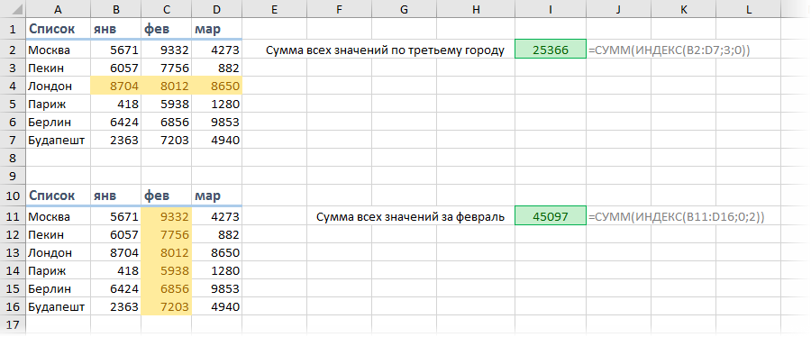 Обратите внимание, что поскольку ИНДЕКС выдает в этом варианте не конкретное значение ячейки, а ссылку на диапазон, то для подсчета потребуется заключить ее в дополнительную функцию, например СУММ (SUM) , СРЗНАЧ (AVERAGE) и т.п